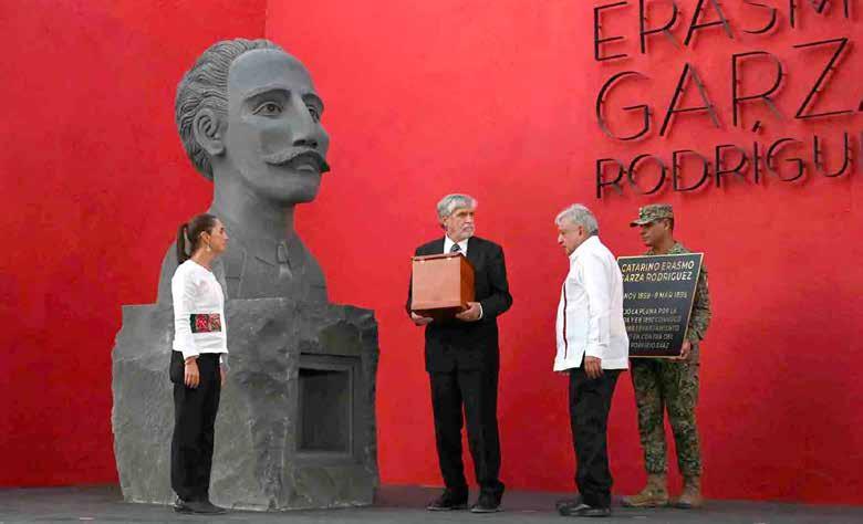 presidente Andrés Manuel López Obrador depositó los restos del revolucionario y antiporfirista Catarino Erasmo Garza Rodríguez en un nicho, junto al busto y monumento que el escultor Pedro Reyes realizó en su memoria, en el puente Puerta México de Matamoros, Tamaulipas.