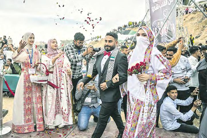se ve a una familia en la playa de Suru, en Bandar Abbas, en el estrecho de Ormuz. A la derecha, palestinos celebran las nupcias de varias parejas en Deir al Balah. Fotos Afp y Ap