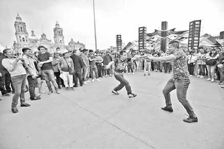bailongo masivo en la Plaza de la Constitución al ritmo de cumbia y salsa que ni la lluvia interrumpió, ya que los más prendidos se quedaron cerca del templete, aunque buen número corrió a guarecerse momentáneamente. El objetivo fue reivindicar la cultura popular del barrio, señaló la titular de la Secretaría de Cultura local. Foto Yazmín Ortega Cortés CARLOS PAUL / P 30