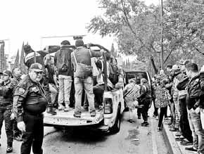 transportados en vehículos pick up de la Secretaría de Seguridad capitalina. La línea, reabierta en octubre tras estar cerrada 15 meses, sigue registrando demoras en el servicio. Foto Alfredo Domínguez
