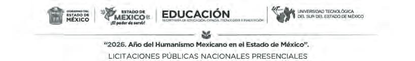 A las personas físicas o jurídicas colectivas, con capacidad legal para presentar propuestas a participar en los siguientes procedimientos adquisitivos de la Universidad Tecnológica del Sur del Estado de México, que a continuación se indican:
