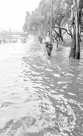 huac y la calle Aquiles Serdán obligó al cierre de la vialidad a fin de evitar que el desplazamiento del agua por la circulación de los vehículos ingresara a los negocios.