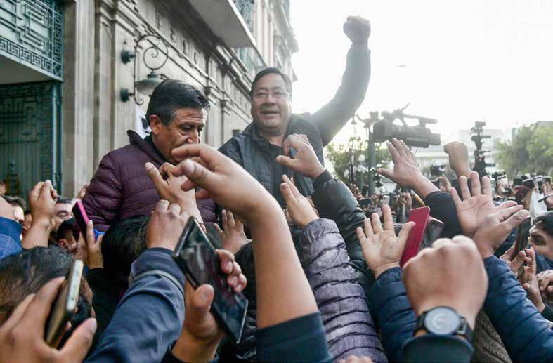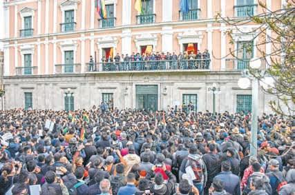 ministros, salió a saludar a una multitud que llegó a la emblemática Plaza Murillo, en La Paz, para respaldar al mandatario. Foto Ap