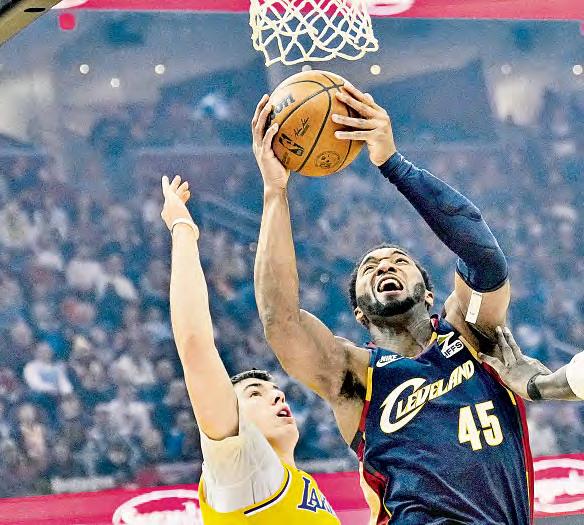 Los Cavaliers derrotaron 129-99 a los Lakers en el partido que se disputó en la Rocket Arena, gracias a una brillante actuación de Donovan Mitchell, quien anotó 25 puntos para su equipo. La figura de los Lakers, LeBron James, solamente aportó 11 unidades y Luka Doncic lideró la quinteta angelina con 29 puntos. En la imagen, Mitchel, de Cleveland (45), anota una canasta superando la defensa de Jake LaRavi,a de Los Ángeles. Foto Ap