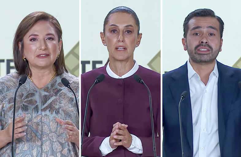 ▲ al inicio del debate entre los candidatos presidenciales Xóchitl Gálvez, de la coalición Pan, Pri y Prd; Claudia sheinbaum, de sigamos Haciendo Historia, y Jorge Álvarez Máynez, de Movimiento