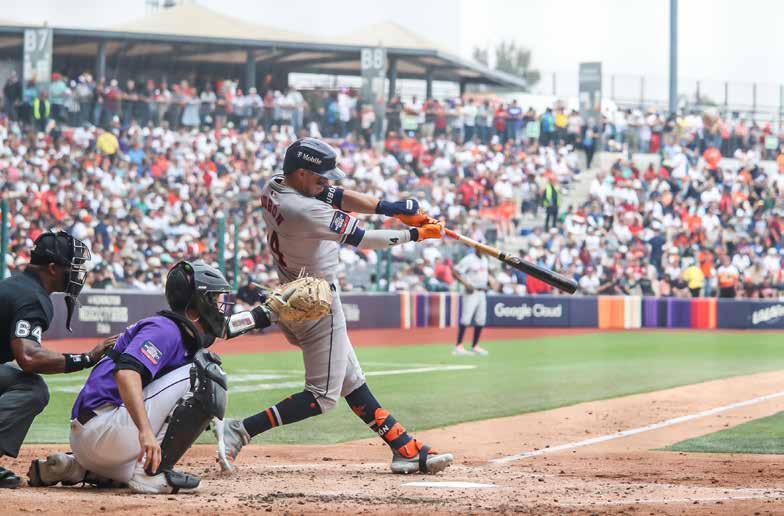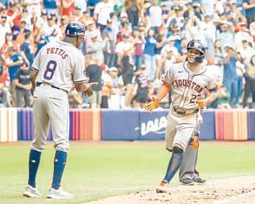 ▲ Con marcador de 8-2, la novena de Houston (al bateo) se llevó los dos partidos ante Colorado en el estadio Harp Helú, en la Magdalena Mixiuhca. El toletero venezolano José Altuve, el más bajo en Ligas Mayores con apenas 1.67 metros de estatura, fue pilar en la victoria con un jonrón y un gran toque. ‘‘Éste ha sido uno de los mejores juegos, sobre todo cuando el equipo venía de una mala racha’’, dijo el segunda base, quien elogió a la fanaticada de México. ‘‘Te hace sentir en casa’’. Foto María Luisa Severiano. juan manuel vázquez / dePortes