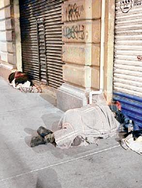 ▲ Con pedazos de cartón, bolsas de plástico, frazadas y hojas de periódico, adultos en situación de calle mitigan las bajas temperaturas, que ayer registraron 7 grados centígrados entre las 5 y las 7 de la mañana, mientras duermen en bancas o en el piso en las inmediaciones del Monumento a la Revolución y afuera de la Lotería Nacional y de la estación Eugenia del Metro. Autoridades han distribuido 30 mil cobijas