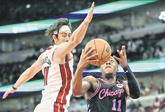 ▲ El mexicano-estadunidense Jaime Jáquez Jr (de blanco) anotó 19 puntos en la victoria del Miami Heat 116-113 sobre los Bulls de Chicago. En otros duelos, los Wizards de Washington derrotaron 109-99 a los Bucks de Milwaukee y los Rockets de Houston superaron 104-86 a los Hawks de Atlanta. Foto Ap