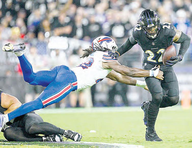 Lamar Jackson y Derrick Henry forman una dupla a la ofensiva difícil de contener en la NFL. Con esta explosiva mancuerna en el ataque, los Cuervos de Baltimore se impusieron 35-10 a los Bills de Búfalo y les arrebataron lo invicto en la jornada cuatro de la temporada. Henry brindó una de sus mejores actuaciones en los últimos años, al realizar la carrera más larga en la historia de la franquicia (87 yardas) y finalizar con un registro de 199 yardas por la vía terrestre, mientras Jackson lanzó dos pases de anotación para 156 yardas, uno con su receptor Justice Hill y otro con el propio Henry, además de penetrar las diagonales con un acarreo de balón. Fue la tercera anotación terrestre de 80 yardas o más en la carrera del ex corredor de los Titanes de Tennessee. Todo salió bien para los Cuervos; incluso cuando Henry perdió el balón en la línea de gol a principios del cuarto periodo, Patrick Ricard cayó sobre el ovoide para concretar la quinta anotación. En contrate, los Bills fueron incapaces de descifrar la defensiva rival, por lo que sus opciones al ataque se vieron limitadas. Su mariscal de campo, Josh Allen, no con-