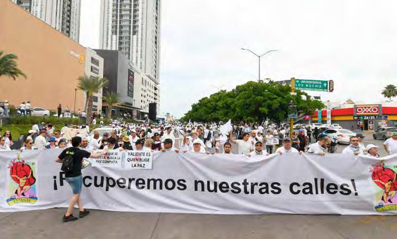 ciudadanos, entre ellos buscadores de desaparecidos, empresarios, transportistas y estudiantes, llegaron vestidos de blanco y portando una lona con la leyenda “Recuperemos nuestras calles”. Foto El Debate IRENE SÁNCHEZ, CORRESPONSAL / P 35