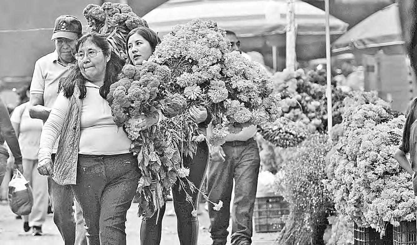 ▲ Compradores se retiran satisfechos del mercado Jamaica, tras adquirir a precios accesibles los manojos de cempasúchil para la ofrenda. Foto Jorge Ángel Pablo García