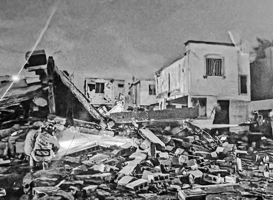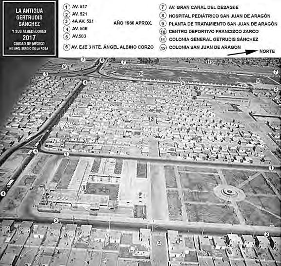 Foto aérea tomada hacia 1960, donde se señalan los principales puntos de la colonia, parte del trabajo del ingeniero Sergio de la Rosa. Rogelio López y María Rita Villanueva Magaña, dos de sus habitantes; el parque central y la parroquia de la Sagrada Familia, sobre Norte 86 y la avenida Victoria. Fotos tomada de redes sociales, acer vo de los vecinosy Jorge Ángel Pablo García