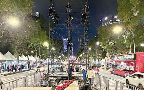 Trabajadores del gobierno de la ciudad laboraban anoche en el montaje del escenario para despedir el 2022 y recibir el Año Nuevo con la presentación de diversos grupos musicales, entre ellos Los Ángeles Azules. Foto Luis Castillo