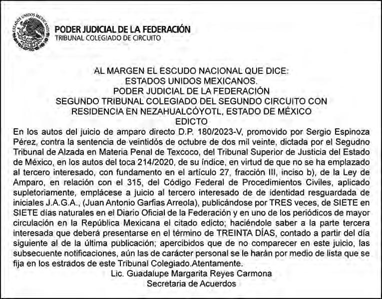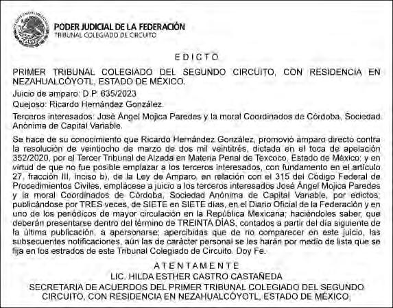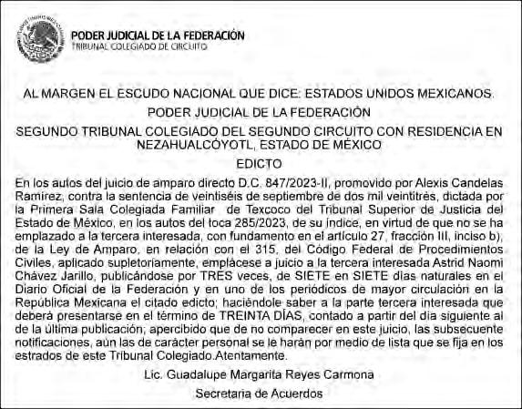 En el juicio de amparo número 589/2024, promovido por Miguel Cruz Vallejo; se emplaza a juicio a la moral Ecomecatrónica, Sociedad Anónima de Capital Variable; parte tercera interesada en el referido procedimiento judicial, en virtud de que se desconoce su domicilio. Cuenta con el plazo de treinta días, contado a partir del día siguiente al de la última publicación del presente edicto para que concurra a este juzgado a hacer valer lo que a su interés conviniere. Se le apercibe que de incumplir esto último, lasche, veintisiete de febrero de dos mil veinticinco.