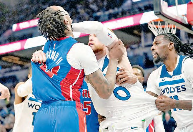 ▲ Ronald Holland (izquierda), de los Tiemberwolves, y Donde DiVicenzo (en medio), se agarraron a empujones. Foto Ap