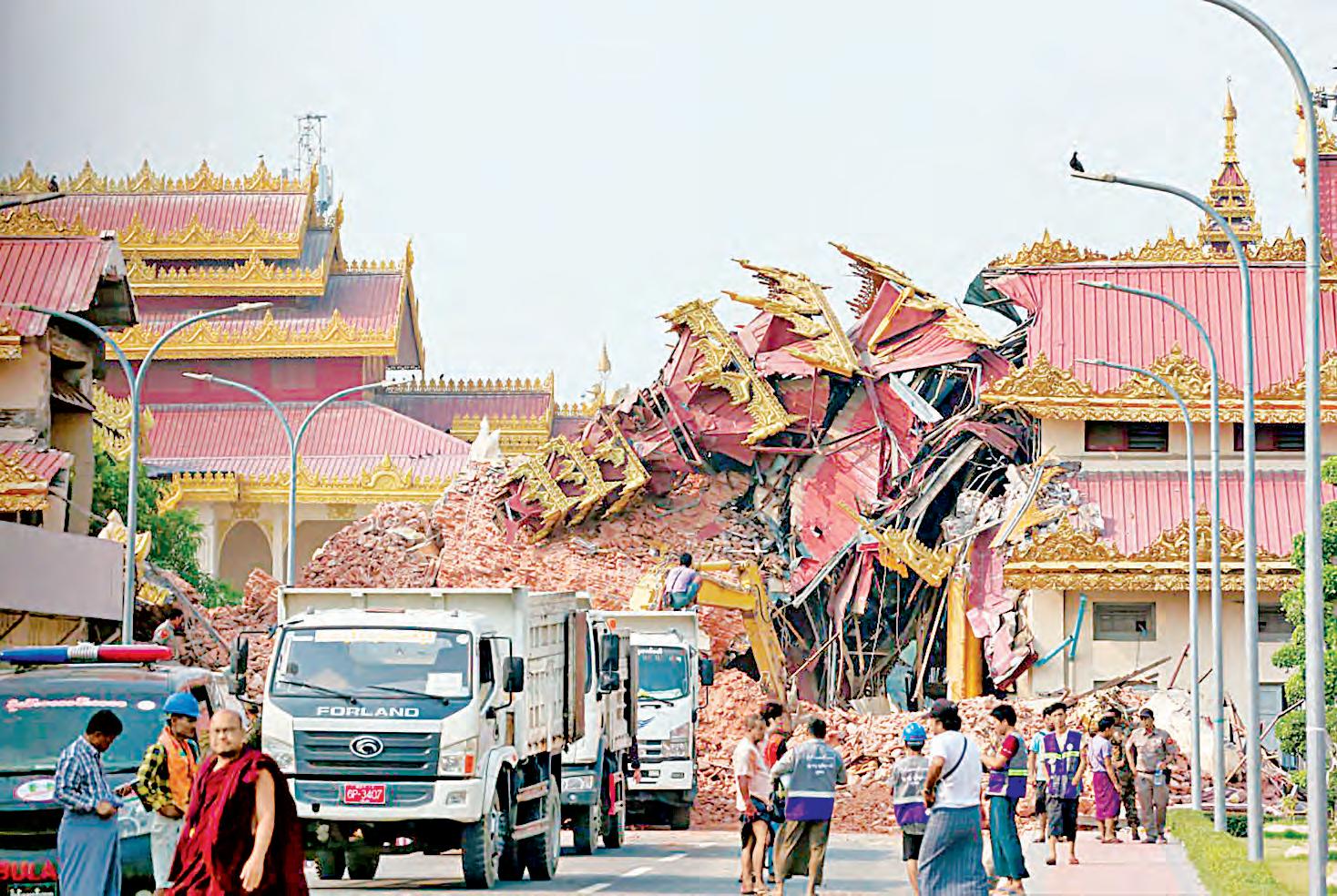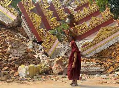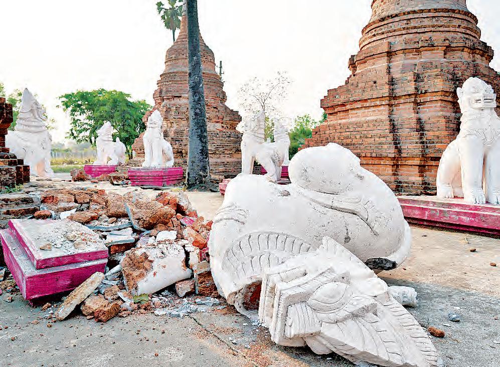 t El terremoto del viernes afectó mezquitas y pagodas con siglos de antigüedad, así como monumentos centenarios. Mientras la ayuda internacional llega de forma gradual, la miseria y el caos provocados por la guerra civil se han profundizado. Opositores al gobierno militar acusaron que éste continúa sus ataques aéreos. Foto Ap aGencias / CuLtura y P 26