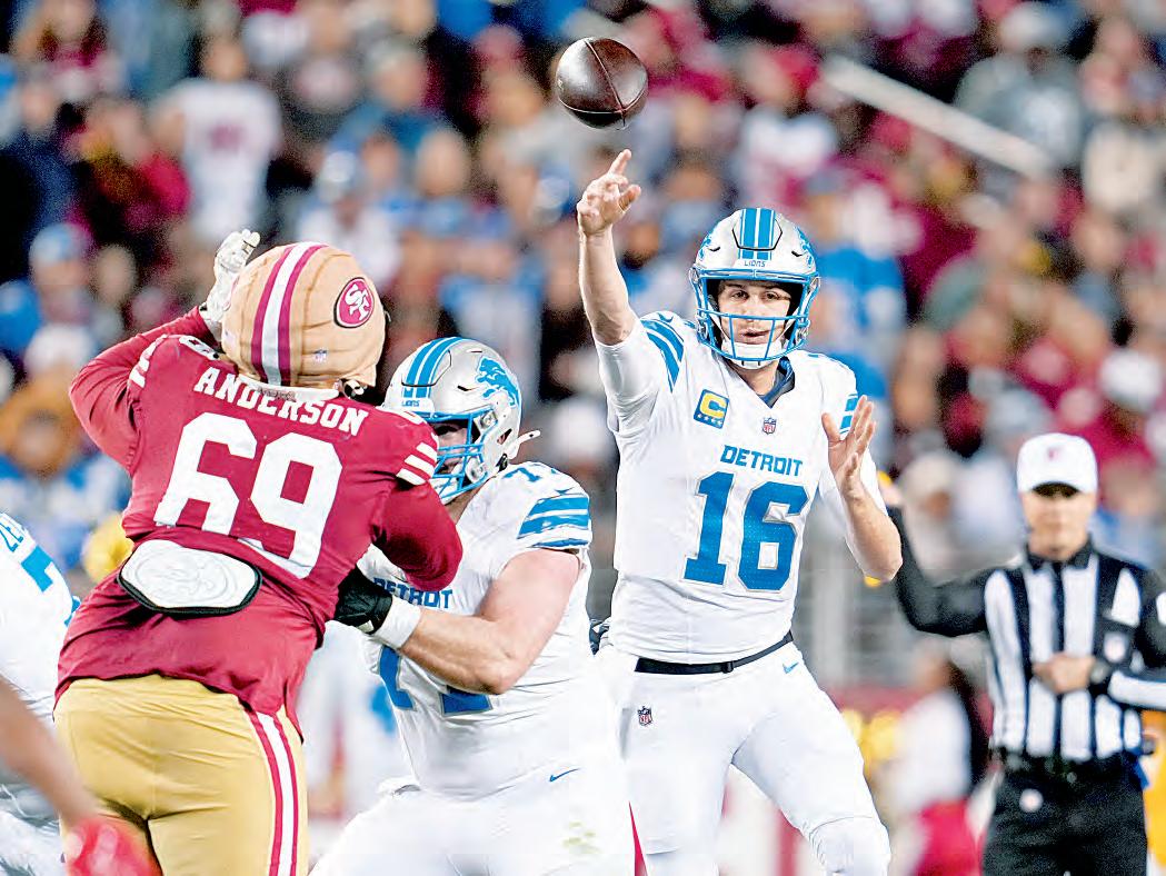 ▲ Los Leones de Detroit se mantienen en la pelea por finalizar la temporada regular de la NFL como el primer sembrado de la Conferencia Nacional, al imponerse ayer 40-34 a los 49ers de San Francisco. Detroit (14-2), ya clasificado hace unas semanas a