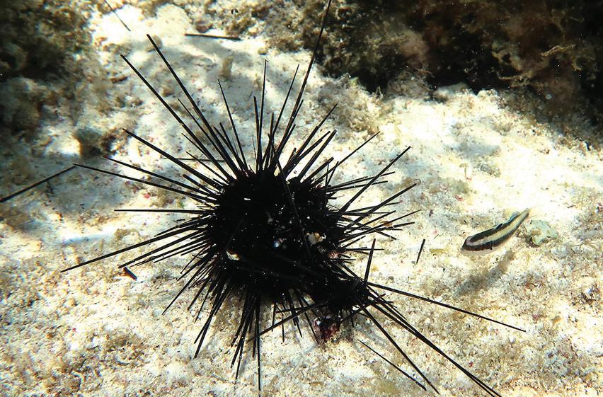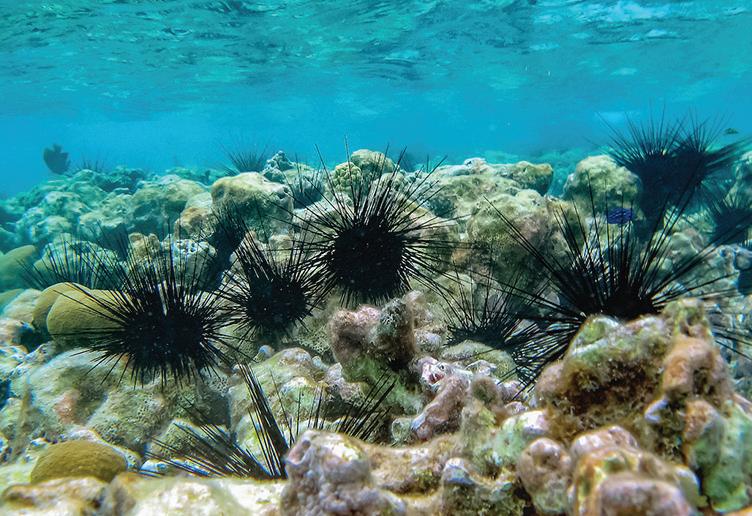Hace 40 años, el erizo de mar de púas largas (Diadema anti llarum) sufrió una mortandad masiva causada por un agen te patógeno desconocido que eliminó más del 90 por ciento de la población a lo largo del Caribe, Florida y las Bermudas. Los erizos de mar “podan” el arrecife del exce so de macroalgas, por lo que la mortandad masiva del eri zo causó grandes cambios al paisaje arrecifal, pasando de sitios cubiertos por corales a