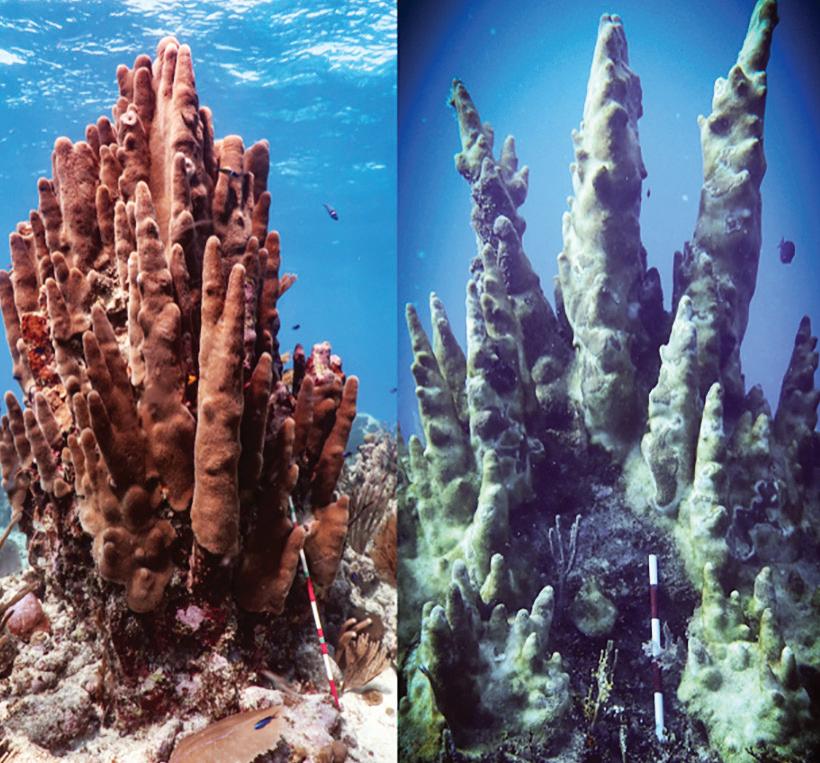 Coral pilar ( Dendrogyra cylindrus), la especie más afectada por el síndrome blanco. A la derecha una colonia sana en banco Chinchorro, a la izquierda una colonia afectada por la enfermedad en la reserva de la biosfera de Sian Ka’an
