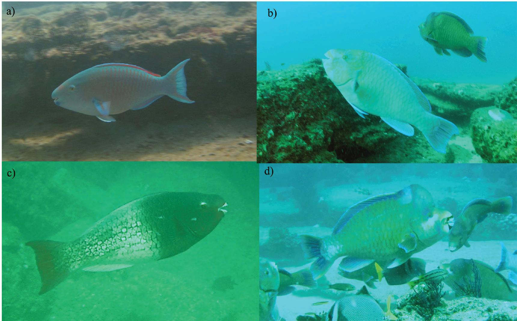 Especies comerciales de pez loro en el sur del Golfo de California: a) Scarus ghobban, b) S. compressus, c) S. rubroviolaceus d) S. perrico