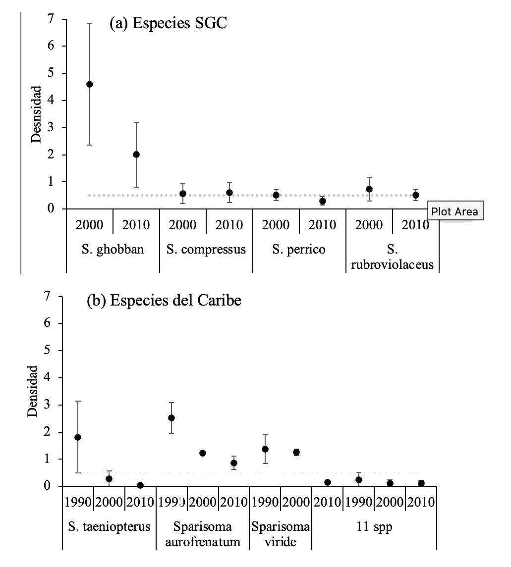 b) Densidades promedio de las especies del Caribe (en Schmitter-Soto et al., 2018)