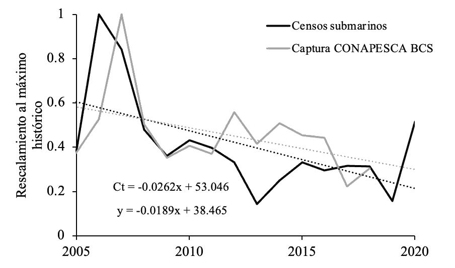 Tendencia poblacional histórica a partir de los datos de los censos submarinos (20052020) y la captura de Conapesca (2000-2018)