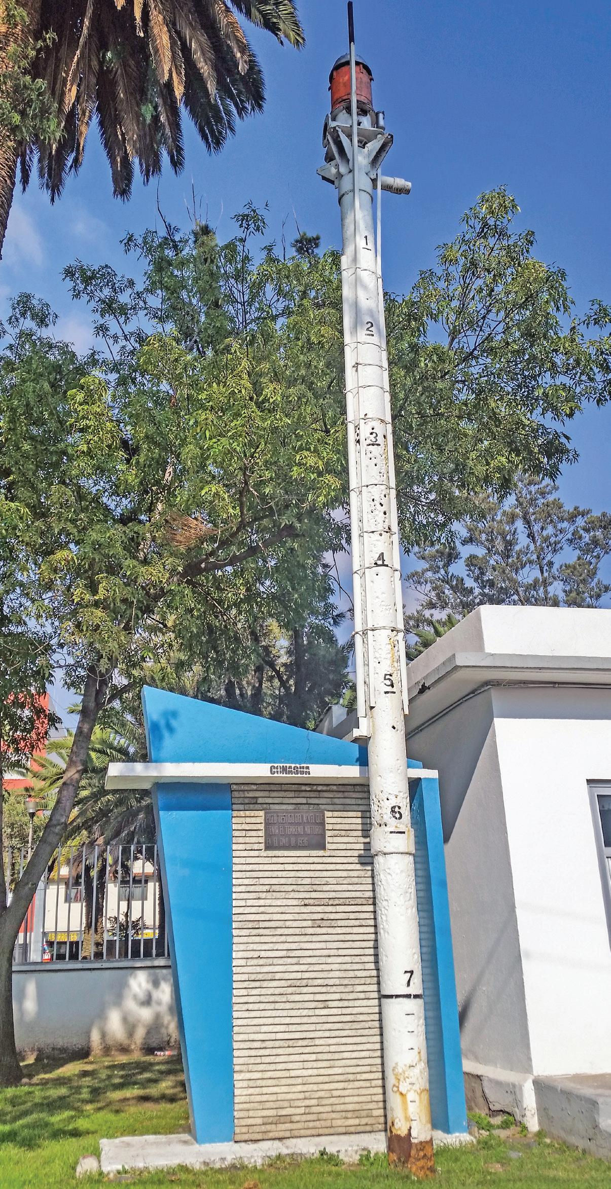 Un pozo, construido en el año 1936 en San Juan de Aragón, Ciudad de México, en lo que ahora son las oficinas del Organismo de Cuenca Aguas del Valle de México (OCAVM), parte de la Comisión Nacional del Agua. Se mantiene como recordatorio visual del hundimiento de toda la zona lacustre. Por su profundidad, el pozo no se hunde, sino el terreno a su alrededor. Los números pintados en su ademe (el tubo) indican cuántos metros se ha hundido la zona desde 1936
