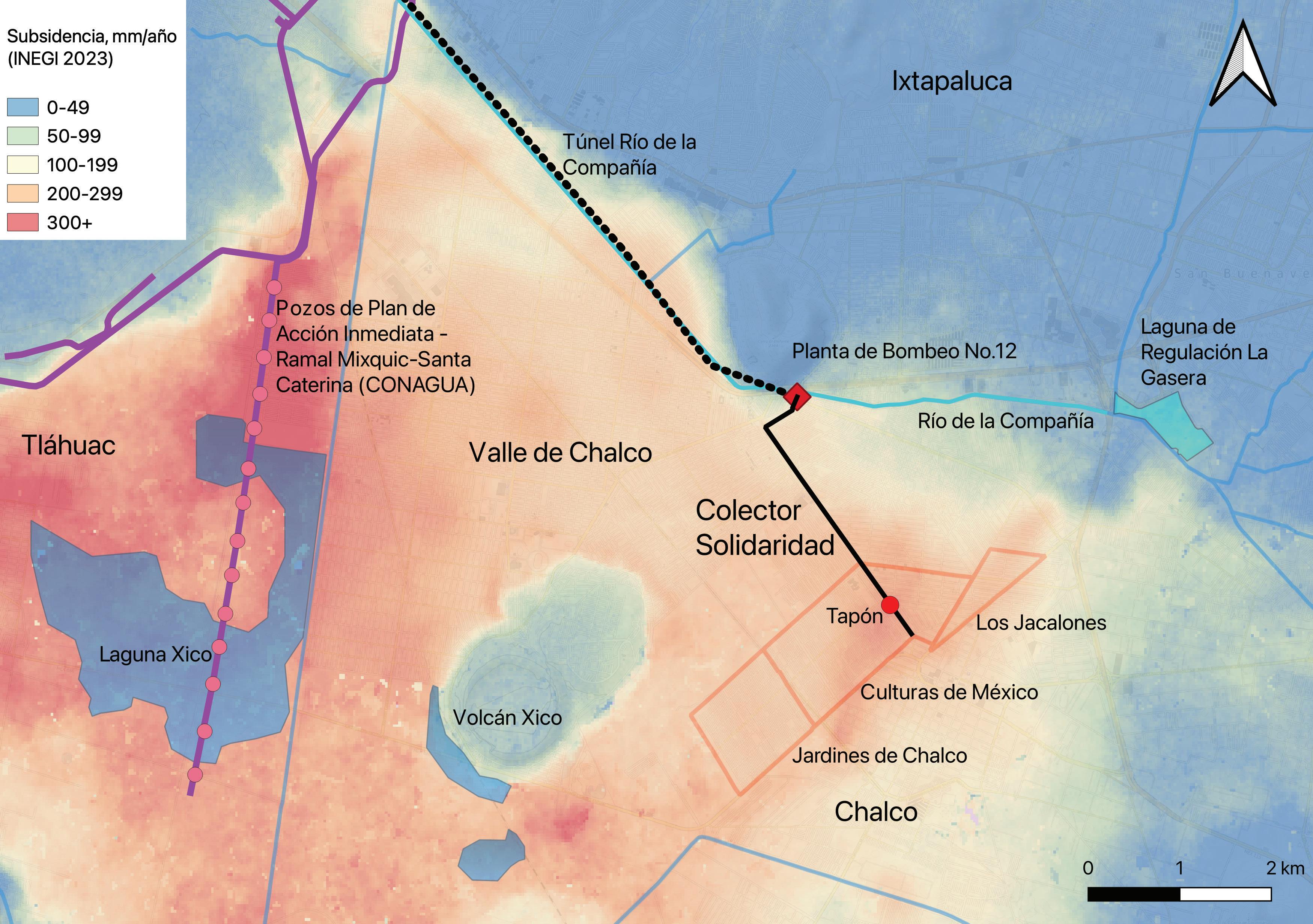 Figura 1. Mapa de la velocidad de subsidencia (el hundimiento) diferencial del terreno en Valle de Chalco y Chalco. En la figura, se nota a la izquierda la batería de pozos (ahora operado por Conagua), que han causado el hundimiento más rápido de la zona (en color rojo) por la laguna Xico. Al lado derecha, se traza la ruta del Colector Solidaridad (en color negro), que va desde la Colonia Culturas de México a la planta de bombeo No. 12. En su recorrido, atraviesa zonas de hundimientos de diferentes velocidades, lo cual provocó su colapso, contrapendiente y taponamiento, causando inundaciones en las colonias señaladas