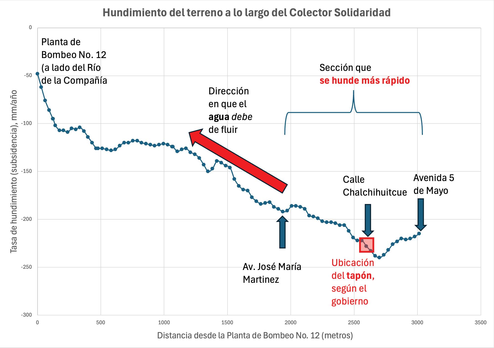 Figura 2. El hundimiento a lo largo del Colector Solidaridad, mostrado en perfil. Los números en el eje vertical indican cuántos milímetros se hunde por año (medido en el año 2022 por medio satelital). Se nota que el colector se está hundiendo más rápido justamente en la zona que se inundó este año, y donde se formó el tapón