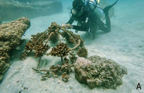 mátipicos por la enfermedad de pérdida de tejido en corales duros (SCTLD por sus siglas en inglés). Para restaurar el arrecife coralino en el parque se han instalado viveros de coral en sitios donde la luz y nutrientes permiten un crecimiento más rápido y seguro que en la barrera arrecifal, dichos fragmentos, al crecer en colonias, se podan para sembrar en sitios que han perdido coral.