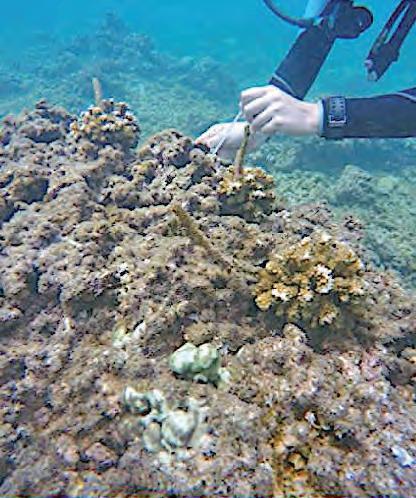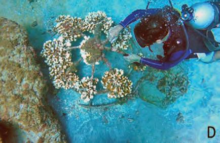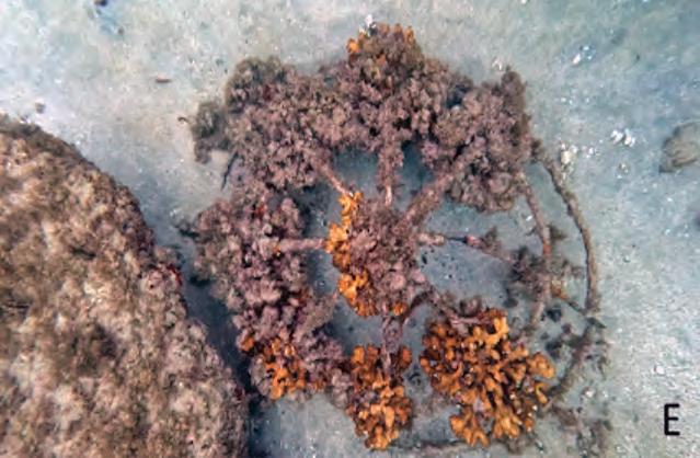 liencia y para noviembre (Fig. 2D), las 15 colonias comenzaron a adquirir una tonalidad parda, sobre todo en la base de las colonias, lo cual fue un indicio de la recuperación. A pesar de lo anterior, el daño ya estaba hecho: en febrero (Fig. 2E) observamos que solo cinco de las colonias de coral sobrevivieron, lo cual representó la muerte del 67 por ciento de ellas.