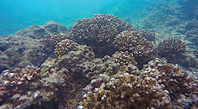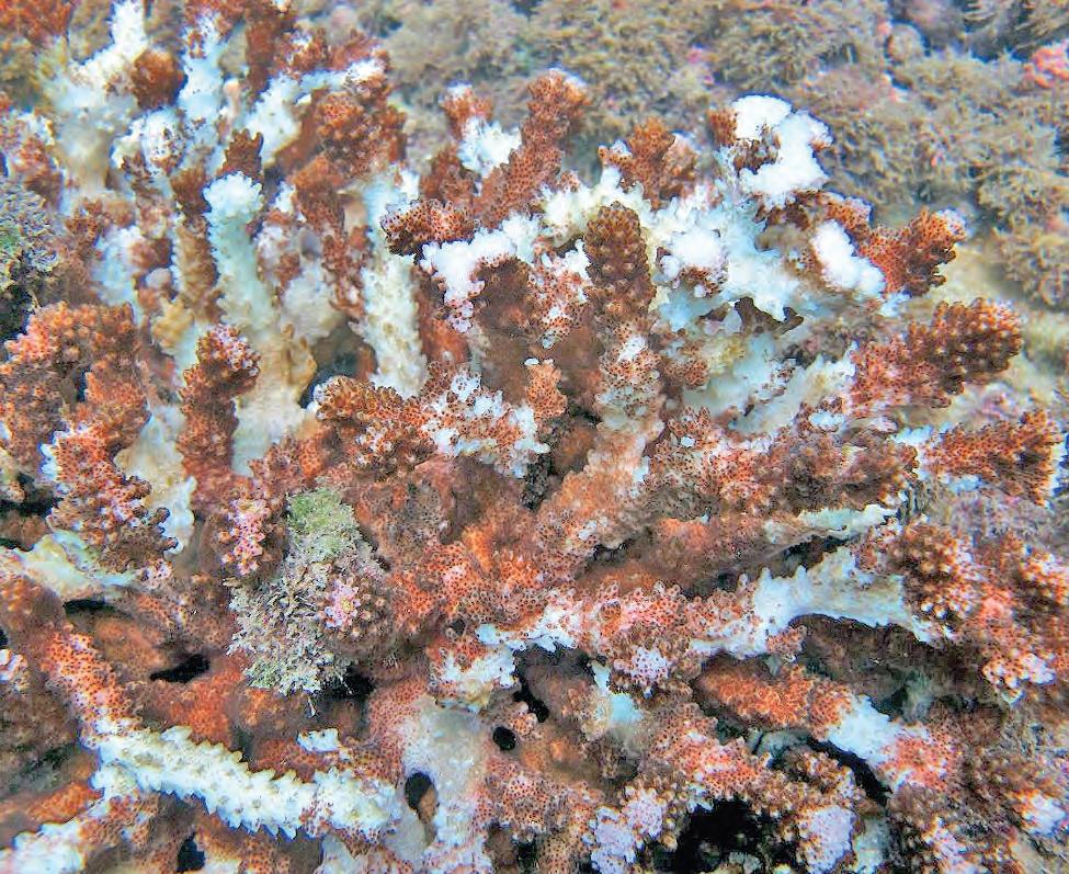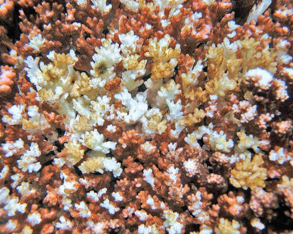 Corales con una parte viva de color marrón y con pedazos que comienzan a blanquearse. El blanqueamiento es una respuesta al estrés extremo ocasionado por las elevadas temperaturas del agua, como lo ocurrido en 2023 en el Pacífico sur mexicano, cuando alcanzó los 33°C
