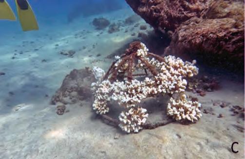 Destacamos que en septiembre llegamos a medir hasta 32 °C en el agua, lo cual es muy superior del umbral de 28 °C que se considera crítico para el bienestar de los corales. En la secuencia fotográfica podrás observar los cambios que sufrieron los corales. En abril (Fig. 2A) la coloración del coral fue normal, es decir, sin estrés. En agosto (Fig. 2B) se observa claramente que las 15 colonias de corales comenzaron a perder su color, lo cual fue un signo de estrés por alta temperatura. En septiembre (Fig. 2C) el blanqueamiento del coral fue total.