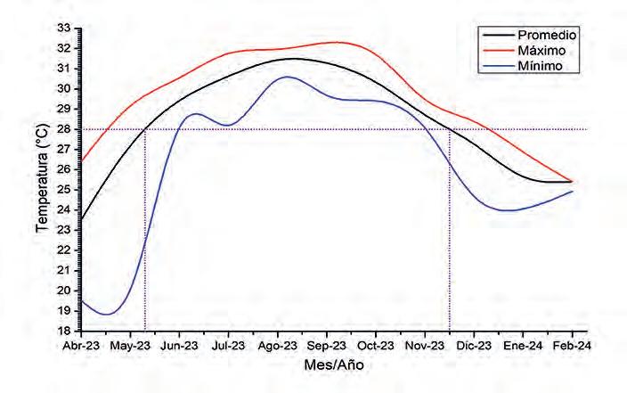 Figura 1. Variación de la temperatura del agua en Isla Isabel, Nayarit, entre abril de 2023 y febrero de 2024. La líneas moradas, punteadas, representan el umbral de estrés térmico para los corales