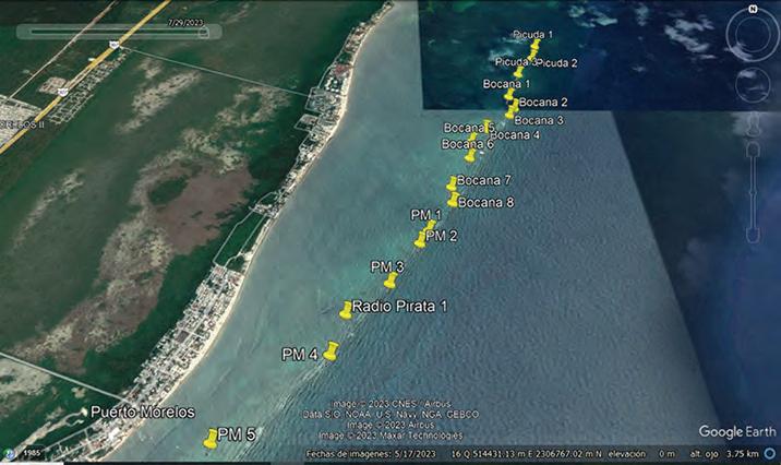 Sitios detectados con mortandad del 100 por ciento de colonias de coral Acropora palmata tras revisión de guardaparques y brigadistas en el Parque Nacional Arrecife de Puerto Morelos, noviembre 2023