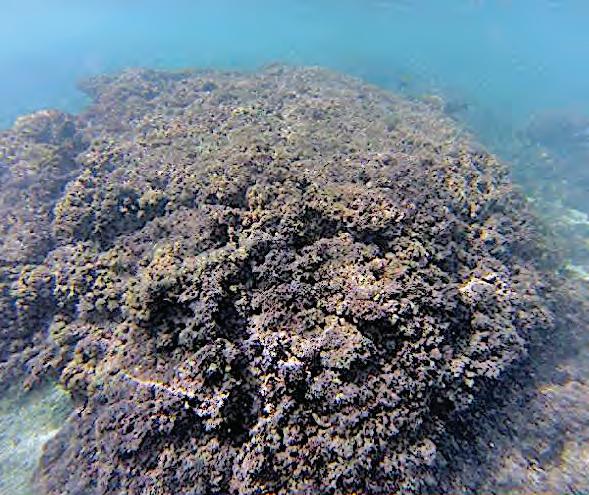 Corales y porciones de arrecife cubiertas con algas filamentosas verdes y rojas después de la muerte de los corales ocurrida durante el año 2023 en el Pacífico sur mexicano. Los visitantes no familiarizados con el estudio de los corales aun creían que eran corales vivos y sanos