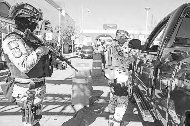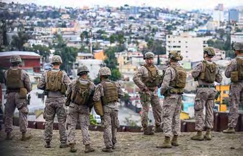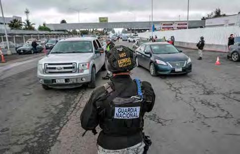 ▲ Marines observan Tijuana desde San Ysidro, mientras agentes de la Guardia Nacional (imagen de la derecha) hacen revisiones a los autos en esa ciudad bajacaliforniana. en dos días, la operación frontera ha detenido a 116 personas y decomisado