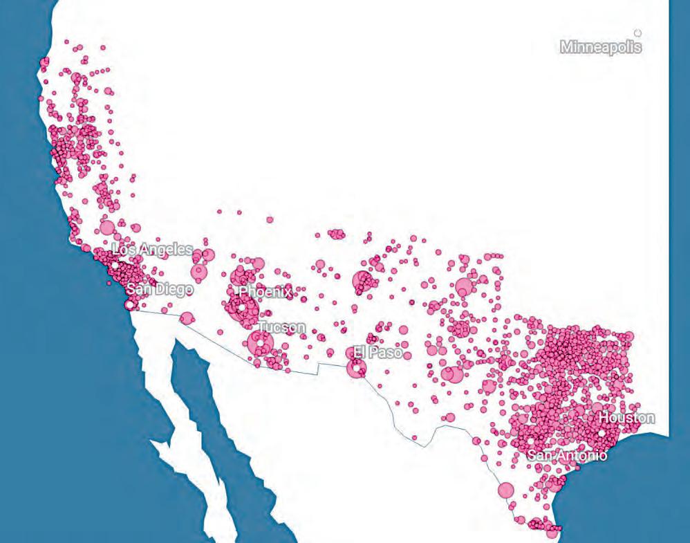 El mapa muestra el número de comerciantes de armas con licencias federales en ciudades a lo largo de Arizona, California, Nuevo México y Texas y que operan en enero de 2025. Estos cuatro estados cuentan