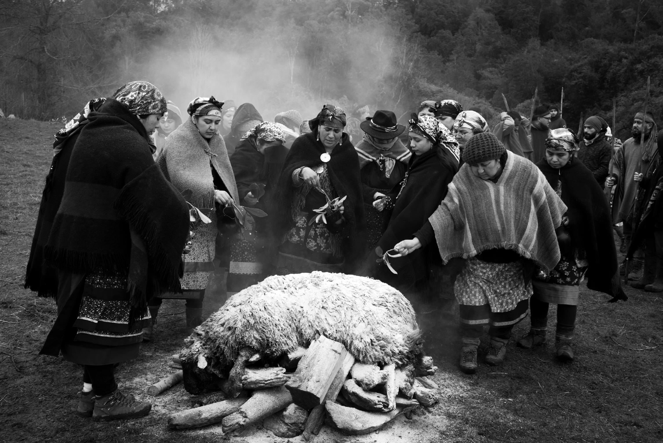 Después de la ceremonia nocturna del Nguillanmawun, las mujeres ofrendan un cordero como forma de agradecimiento, Maihue, Los Ríos, Chile, 26 de junio de 2023. Foto: Pablo Piovano