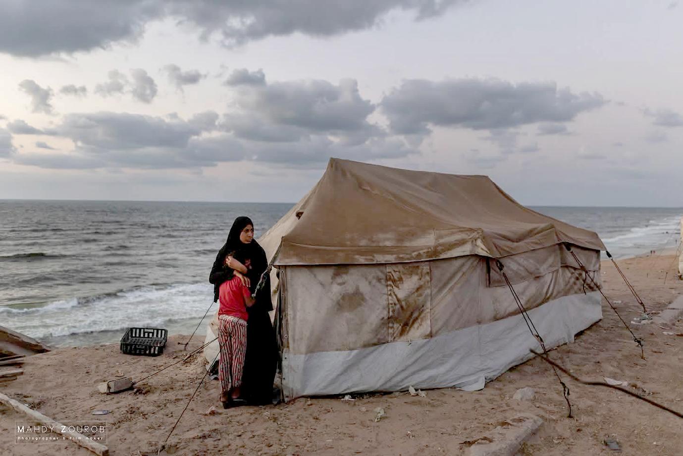 A orilla del Mediterráneo en Gaza, una madre abraza con fuerza a su hija, como si fuera su último escudo contra el miedo. Foto: Mahdy Zourob / Palestina International Broadcast