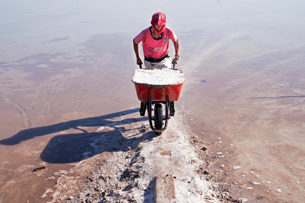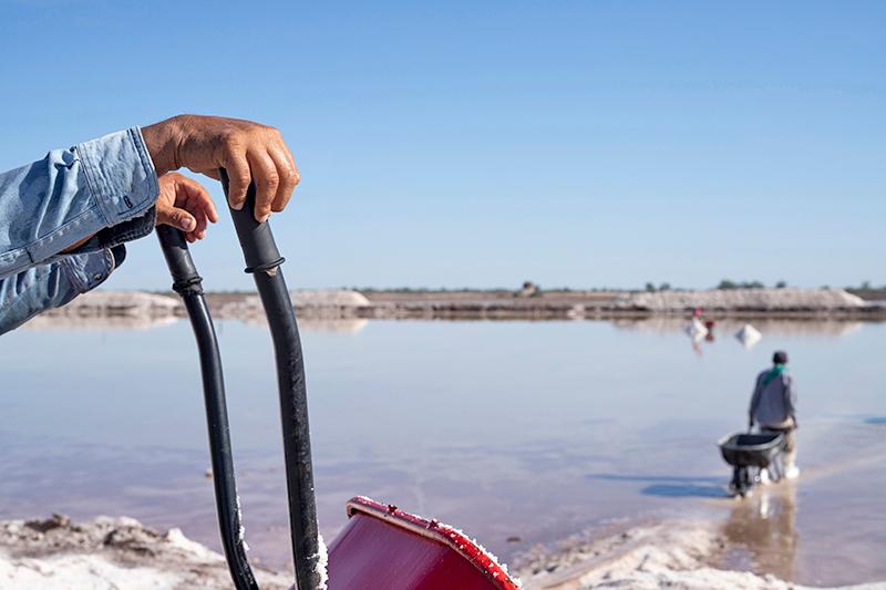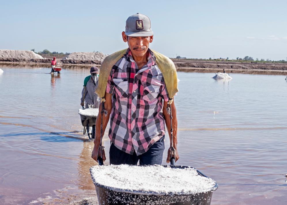 “Es pesado el acarreo de sal”, comenta Elías Bajeca, un jornalero mayo-yoreme que tiene mas de quince años laborando en las salineras de la región. Cuando no hay trabajo en la pesca, va a las granjas de sal a arriar. Comienzan su día laboral a las seis de la mañana y les pagan por carretilla treinta pesos el destajo. Algunos logran hacer hasta diez carretillas por día. Es un oficio temporal durante el año. Los cultores de sal artesanal producen a partir de cuarteles de agua (lagunas solares en el Mar de Cortés), y se ubican cerca de la costa de la playa de Santa Bárbara, en Huatabampo, Sonora. De acuerdo al criterio de alguno de los contratistas, es uno de los oficios históricos más duros y escasamente gratificantes económicamente.