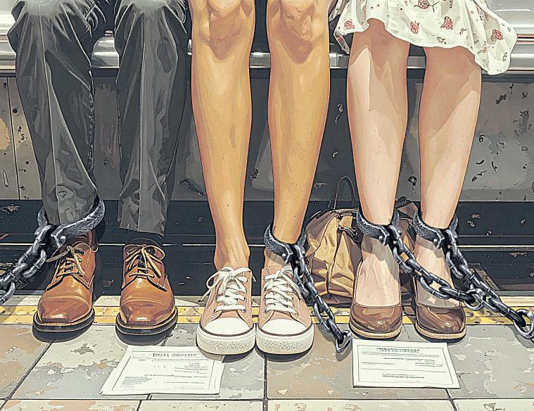 Caminé hacia los andenes y vi que la gran mayoría de las personas arrastraban pesadas cadenas, unas más grandes que otras. Por fortuna las mías no eran tan ostentosas, pero sí me dificultaban la marcha. Grupos de mujeres con pancartas de “feministas arrepentidas” lloraban desconsoladamente y se abrazaban unas a otras por haber desafiado al poder patriarcal. Cuando el vagón se abrió, era muy difícil entrar porque los que salían se enredaban con las cadenas de los que pretendían abordar el convoy. Cuando logré entrar y me deslicé entre tantos ciudadanos encadenados, pude sentarme porque unos guardias rubios y altos bajaron a unos vendedores ambulantes que hacían propaganda subversiva y llamaban a votar con conciencia de pobres. Nadie se atrevió a intervenir porque les pesaban las cadenas y porque estaban atemorizados por la presencia de estos grupos de vigilantes de Primer Mundo. Extraje de mi mochila un libro para leer hasta la estación cercana a la universidad. Me llevé la sorpresa de mi vida. Mi libro estaba encadenado al fondo de la bolsa y tenía una cadenita como separador.