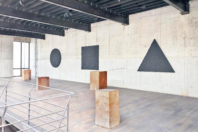 El elegante edificio de ladrillo y concreto diseñado por Alberto Kalach, que se integra con discreción al paisaje de esta zona industrial de la ciudad, fue inaugurado en 2023 y cuenta con cuatro pisos con amplias salas de exhibición y terrazas, en las que el curador distribuyó los diversos cuerpos de obra del artista. Tanto en sus pinturas como en sus esculturas, Bosco deja un espacio de acción al azar, en un juego de complicidad con los materiales que actúan por sí solos dando lugar a efectos imprevisibles. De aquí su fascinación por el wabi sabi, la filosofía japonesa de la belleza en la imperfección de la naturaleza que está muy presente en sus pinturas de gruesa calidad matérica, cuyas superficies agrietadas son el resultado de la acción del tiempo, así como en sus esculturas en barro artesanal, bronce y esmaltes, en las que el proceso técnico también privilegia la intervención del azar. En ambos lenguajes prevalece en cada pieza la potencia de la mano del artista aun si se trata de una producción serial. En cuanto a su propuesta curatorial, Alberto de los Ríos nos explica: “Como historiador del arte me interesa mucho mostrar las referencias artísticas y diálogos con figuras como Corneille, Lee Ufan, Noguchi, Miró, Malevich, Giacometti, Donald Judd…, obviamente también está la presencia de los artesanos oaxaqueños con la producción en barro.” Se presenta por primera vez en México su trabajo con cubos de concreto que ensambla en esculturas móviles que remiten a Calder y a Noguchi en su concepción, pero también al arte povera en la elección del material. También son inéditos su Homenaje a Kazimir Malevich, un conjunto de tres telas negras trabajadas en las formas geométricas elementales, y su diálogo con Joan Miró en Vers l´Espagne,donde su pintura explora tonalidades luminosas. Entre las novedades destaca una suerte de picto-escultura mural realizada en una superficie de madera laqueada en negro de la que emerge una forma orgánica de voluminosa densidad matérica y crea un poderoso juego de contrastes que remite a la