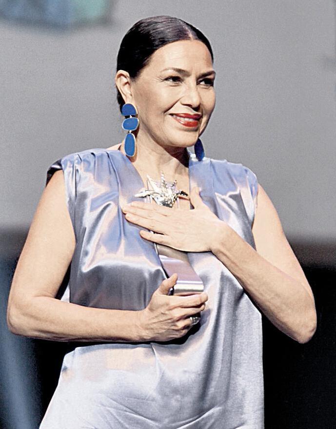 ▲ Izquierda: Dolores Heredia recibe el Mayahuel de Plata en el FICG 40. Foto: Arturo Campos Cedillo. Arriba: Dolores Heredia en Huérfanos. Foto cortesía Canal 22.
