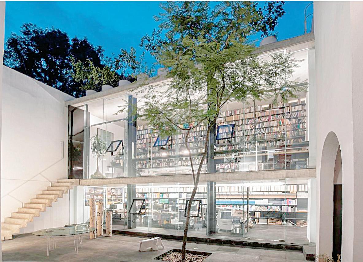 2.50 con un pasillo volado y traslúcido de cristal doble templado de 9 mm. Esto último le da transparencia y desde abajo cualquier interesado, por el área y tema, puede ver el último de sus estantes y localizar un libro específico. El piso es de recinto negro de losetas perfectamente cortadas y colocadas a hueso. La ventanería es un alarde: se trata de cristales de una hoja con entrantes y salientes para que no se vean las costillas y trabajen como atiesadores, pero además poseen una serie de ventanas caladas sobre el cristal con su marco para darle ventilación y evitar un efecto de invernadero. Así el lugar es fresco y seco. La escalera interior es de pasos cuatrapeados y aprovecha los peraltes para libreros, como hiciera el arquitecto Carlo Scarpa en Castelveccio. La escalera exterior de concreto descansa en el piso y el muro poniente, pero no llega a tocar la losa del ingreso. La finura de ese tipo de detalles, que Gómez-Pimienta cultiva desde joven en sus obras (Felipe Leal ha escrito que es capaz de proyectar “de la taza a la casa”), está presente en la unión de dos o más materiales; para entender sus sistemas