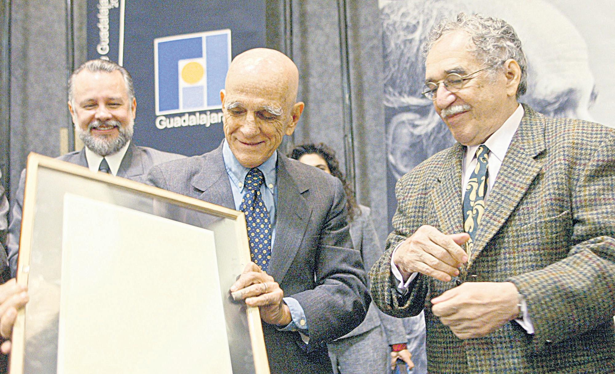 s José Trinidad Padilla López, rector de la Universidad de Guadalajara, Rubem Fonseca y Gabriel García Márquez en la entrega del Premio Juan Rulfo, en Guadalajara, noviembre de 2003. Foto: Carlos Cisneros.