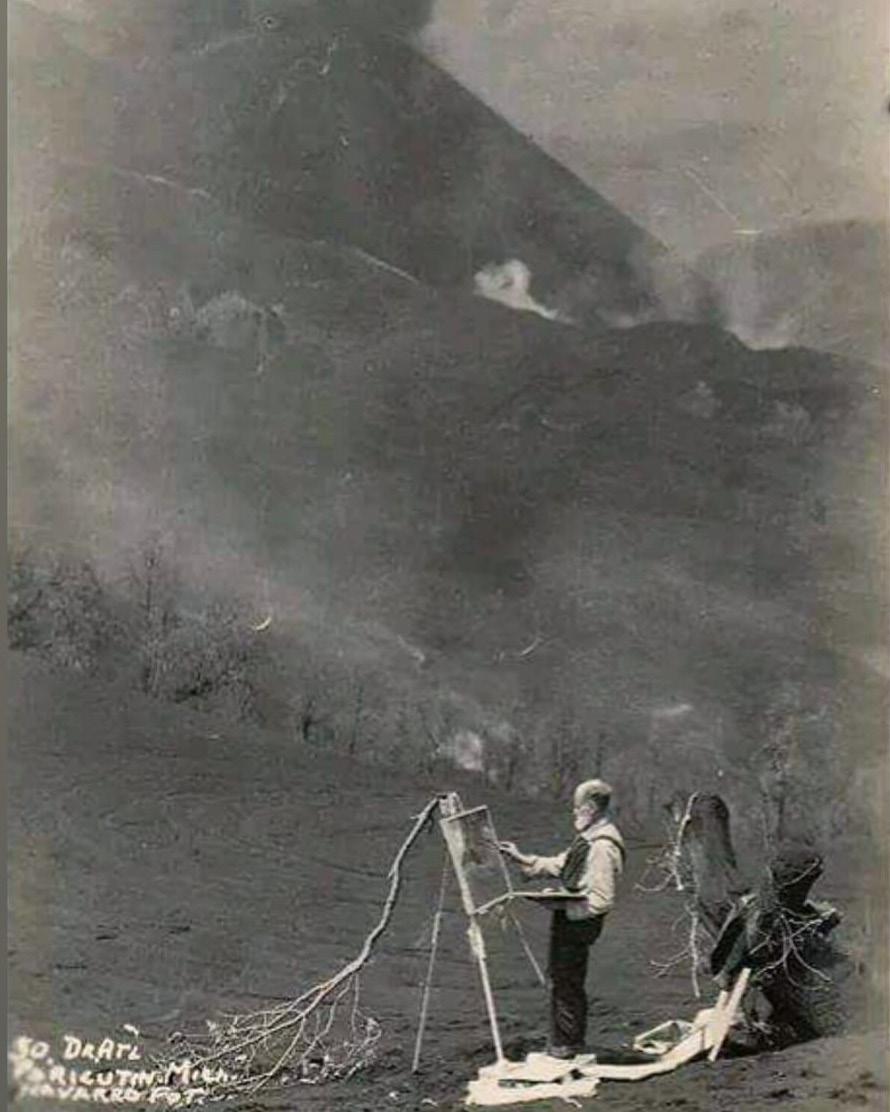 Gerardo Murillo (Dr. Atl) realizando una de sus pinturas en plena actividad del volcán Paricutín, en 1943