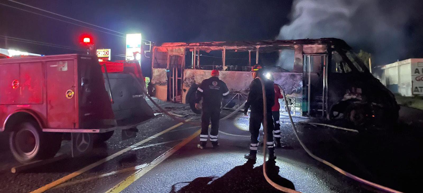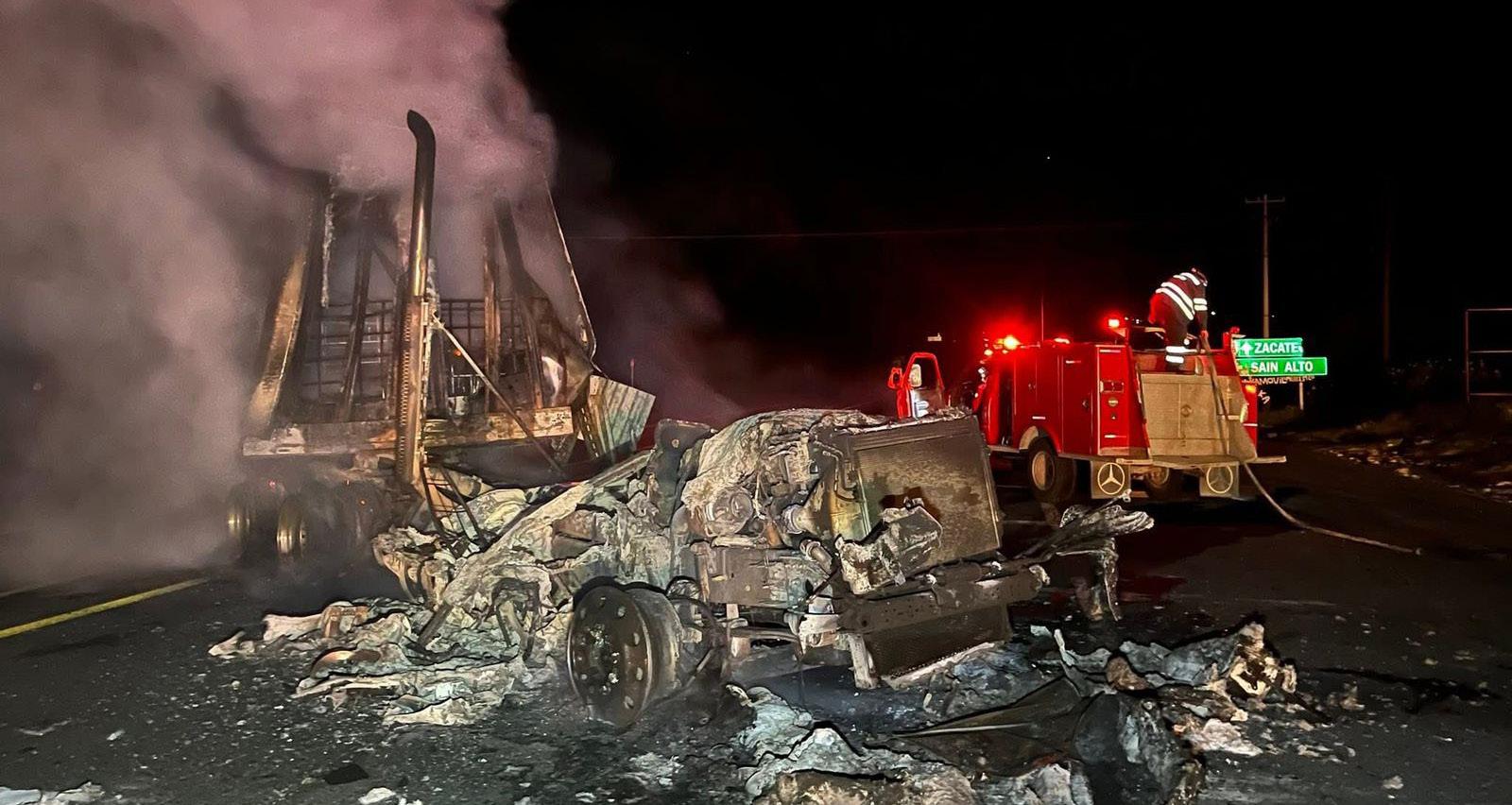 La madrugada de este viernes se registraron once bloqueos carreteros en distintos municipios de Zacatecas, donde grupos criminales incendiaron 37 vehículos -incluidos cuatro autobuses de pasajeros y varias unidades de carga-, además de casetas de peaje en Fresnillo. En el municipio de Fresnillo fue localizado sin vida un chofer originario de Guadalajara, Jalisco, confirmó la Fiscalía General de Justicia del Estado (FGJEZ). El titular de la FGJEZ, Cristian Paul Camacho Osnaya, informó que el hombre fue hallado sin vida en la comunidad de Rancho Grande, Fresnillo, y ya está identificado como el conductor de uno de los vehículos. Fotos: Unidad Municipal PC y Bomberos Sain Alto
