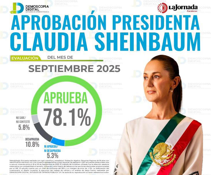 De acuerdo con la medición correspondiente al mes de septiembre de 2025, que realiza la casa encuestadora Demoscopia Digital, la presidenta de la República, Claudia Sheinbaum Pardo, logró una aprobación ciudadana del 78.1%, con una desaprobación de únicamente 10.8%, 5.3% que se mantienen al margen, no aprueban ni desaprueban y el restante 5.8% no otorgó respuesta alguna.