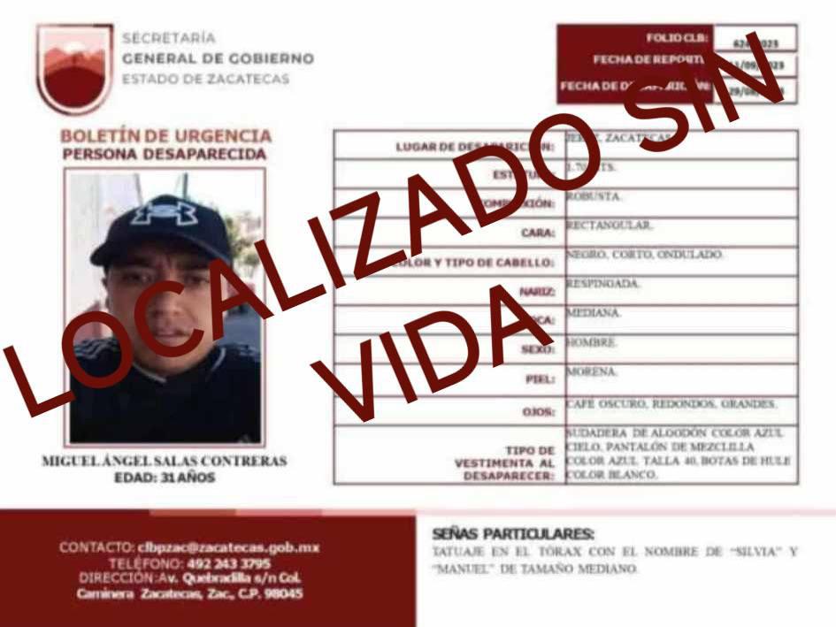 Miguel Ángel Salas Contreras, joven de 31 años, desaparecido en Jerez desde el 11 de septiembre de 2023, fue identificado sin vida durante las labores de búsqueda realizadas por el Colectivo “Los Escarabajos”, en la comunidad El Caquixtle, en el municipio de Tepetongo. Miguel Ángel es el segundo en ser oficialmente reconocido tras los hallazgos de al menos cinco fosas clandestinas en dicha comunidad el pasado mes de octubre.